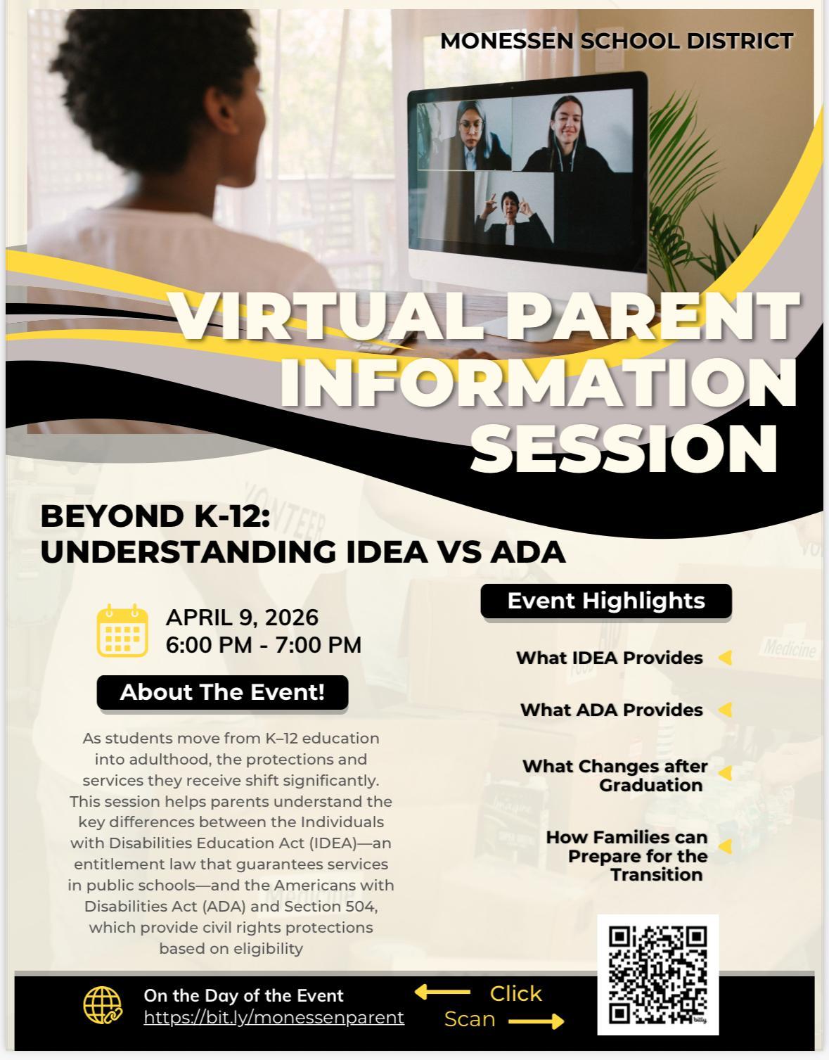 MCSD Virtual Parent Information Session: Beyond K-12 Understanding IDEA vs ADA Click for more information